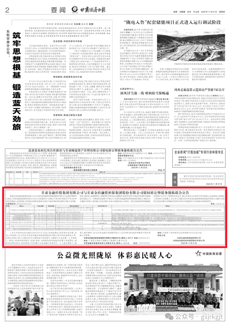 甘肅金融控股集團有限公司與甘肅金控融資擔保集團股份有限公司債權轉讓暨債務催收聯合公告